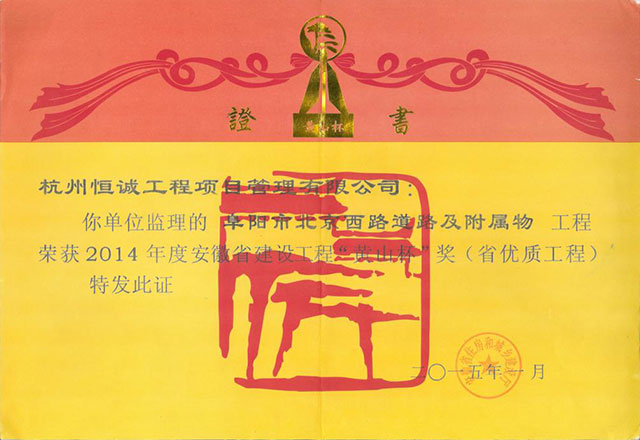 阜陽(yáng)市北京西路道路及附屬物工程榮獲2014年度安徽省建設(shè)工程“黃山杯”獎(jiǎng)(省優(yōu)質(zhì)工程)