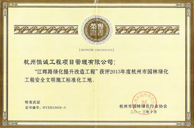 “江暉路綠化提升改造工程”獲評(píng)2013年度杭州市園林綠化工程安全文明施工標(biāo)準(zhǔn)化工地