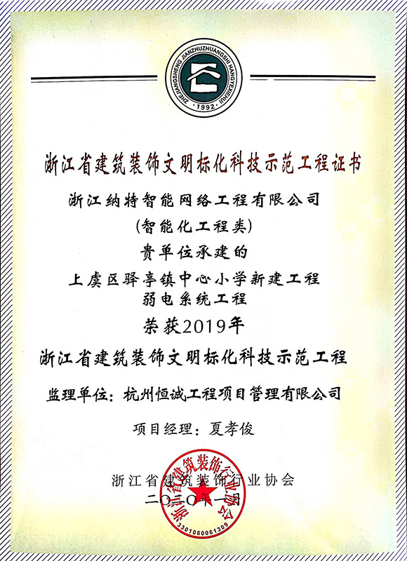 上虞區(qū)驛亭鎮(zhèn)中心小學(xué)新建工程弱電系統(tǒng)工程,榮獲2019年“浙江省建筑裝飾文明標(biāo)化科技示范工程”