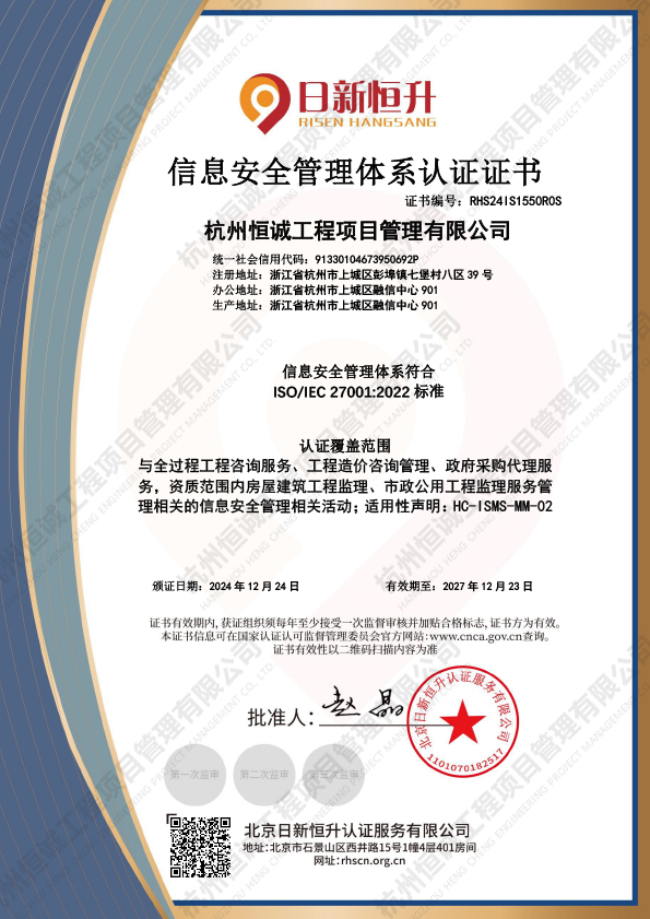 信息安全管理體系認證證書