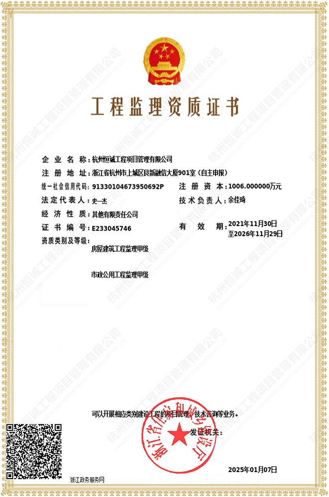 房屋建筑工程監(jiān)理甲級 市政公用工程監(jiān)理甲級